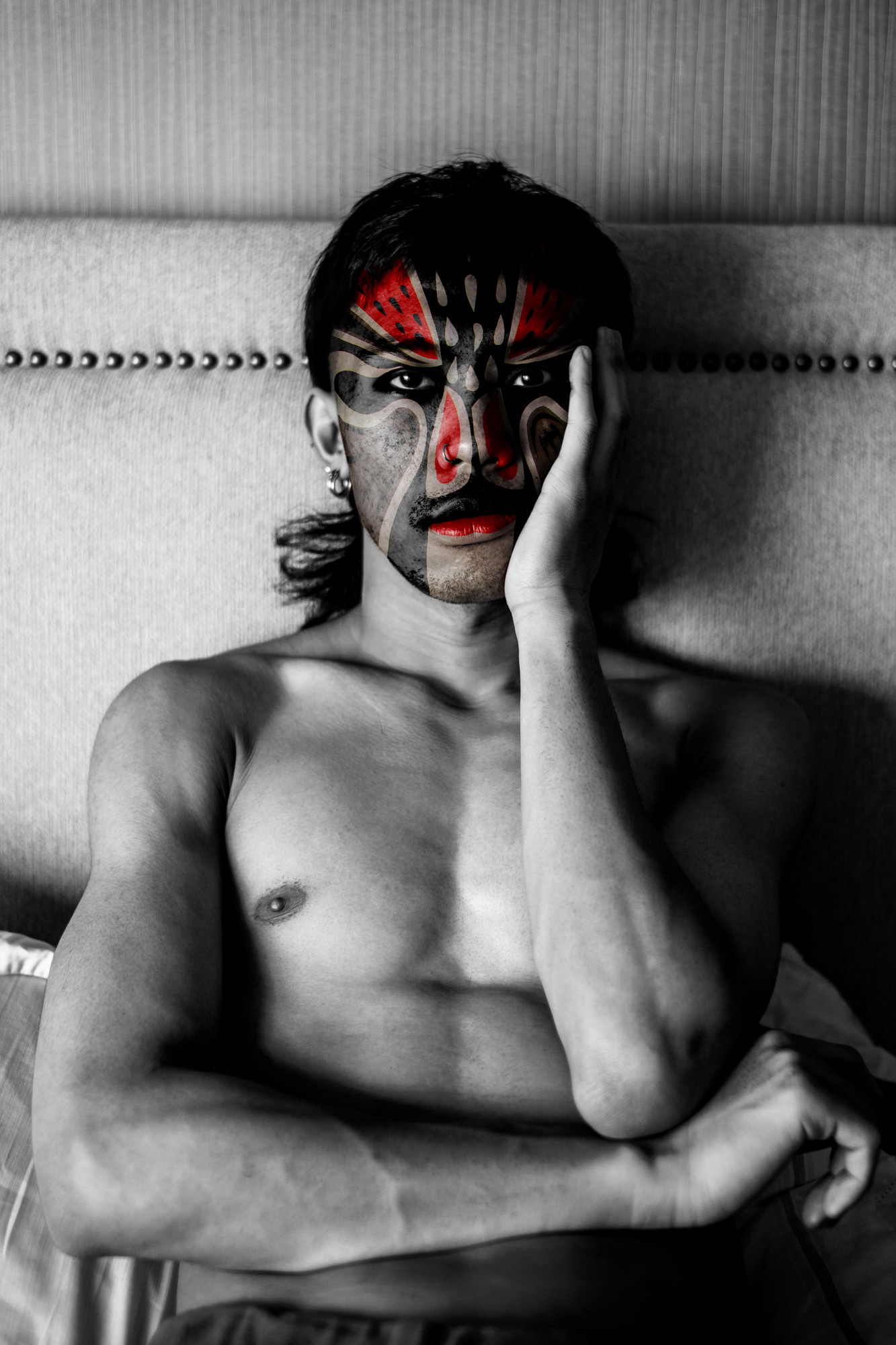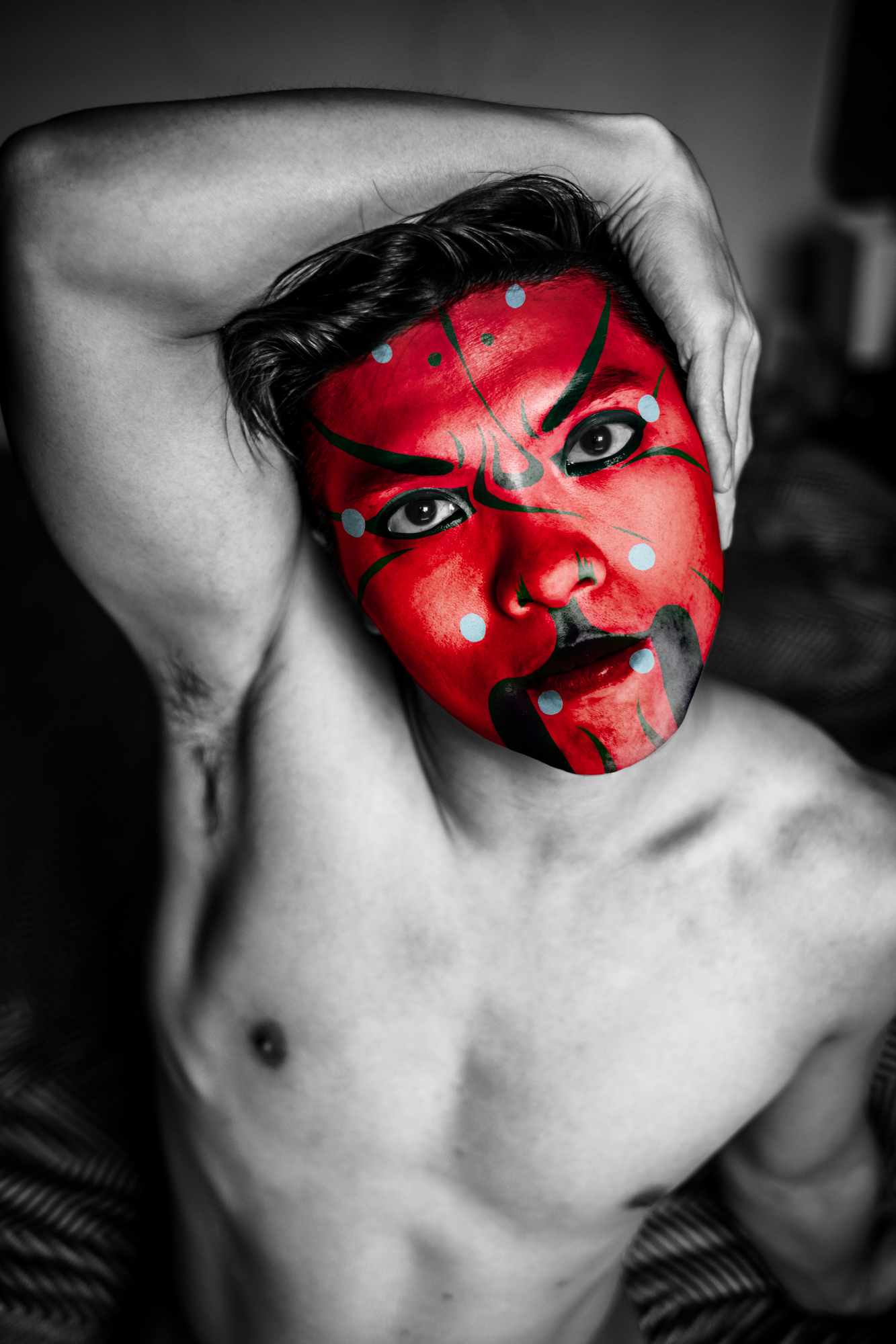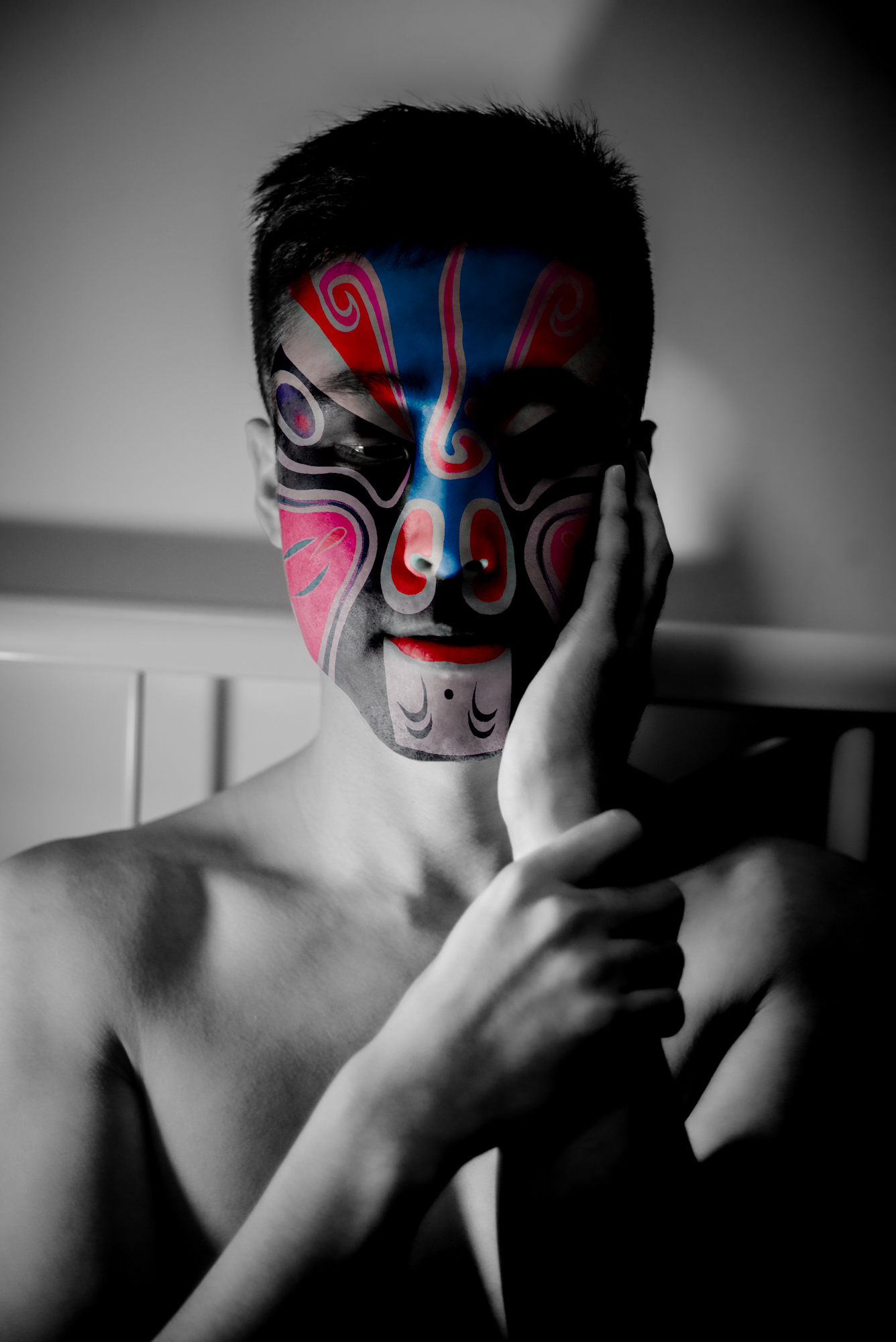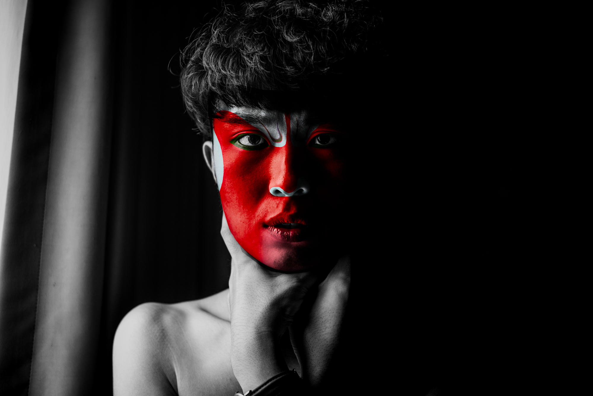 Les couleurs et les motifs obéissent aux codes de l’Opéra de Pékin, où le visage peint, d’une grande complexité, révèle la personnalité de l’acteur — ici, du modèle. Là où le rouge évoque le danger ou la menace dans la culture occidentale, il incarne en Chine la loyauté et la droiture.