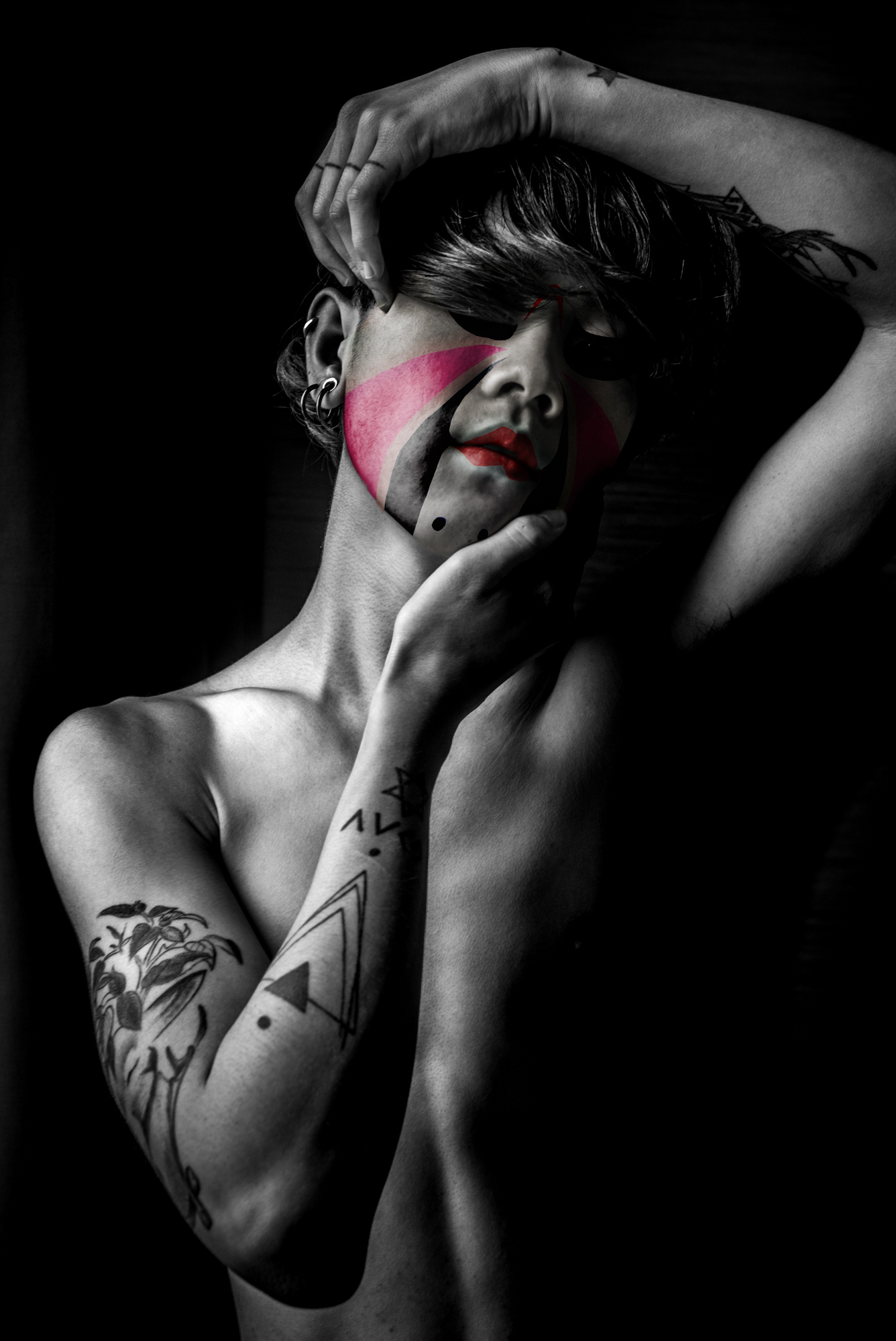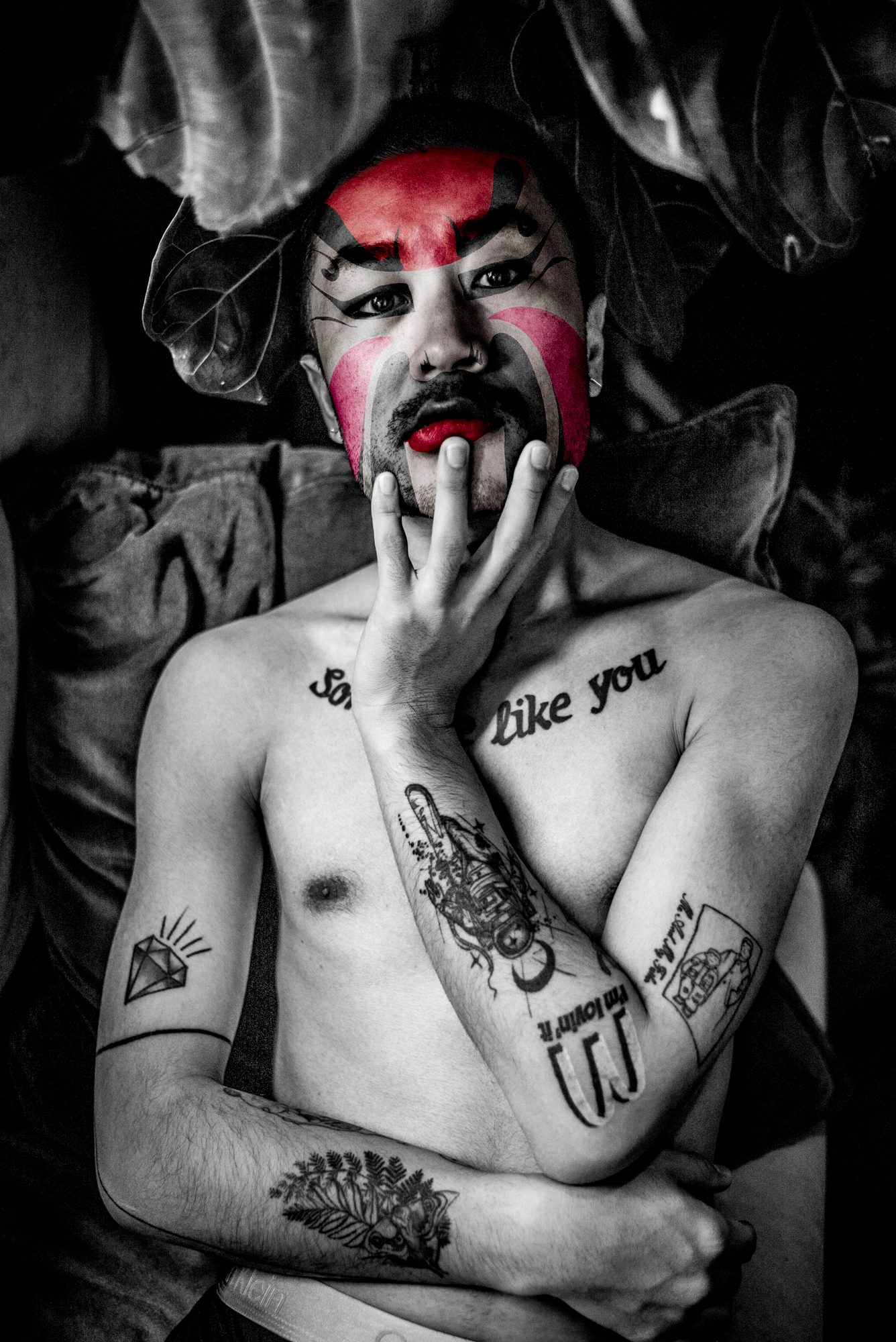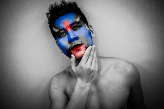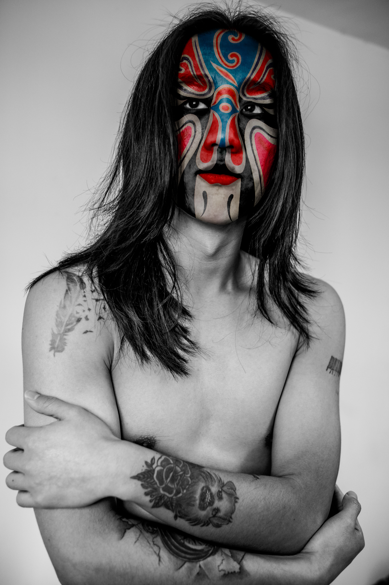 Les couleurs et les motifs obéissent aux codes de l’Opéra de Pékin, où le visage peint, d’une grande complexité, révèle la personnalité de l’acteur — ici, du modèle. Là où le rouge évoque le danger ou la menace dans la culture occidentale, il incarne en Chine la loyauté et la droiture.