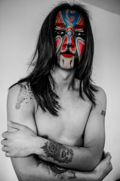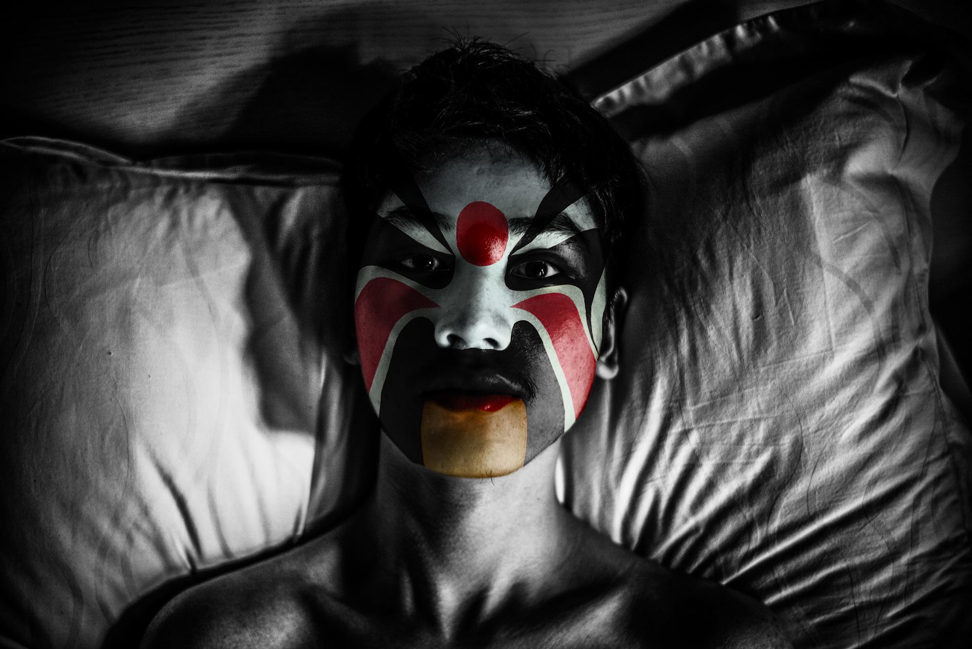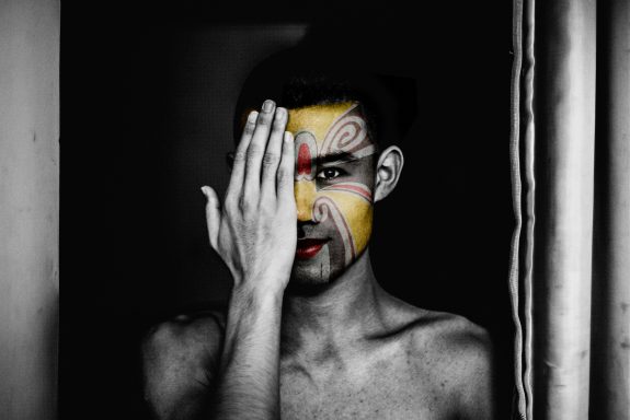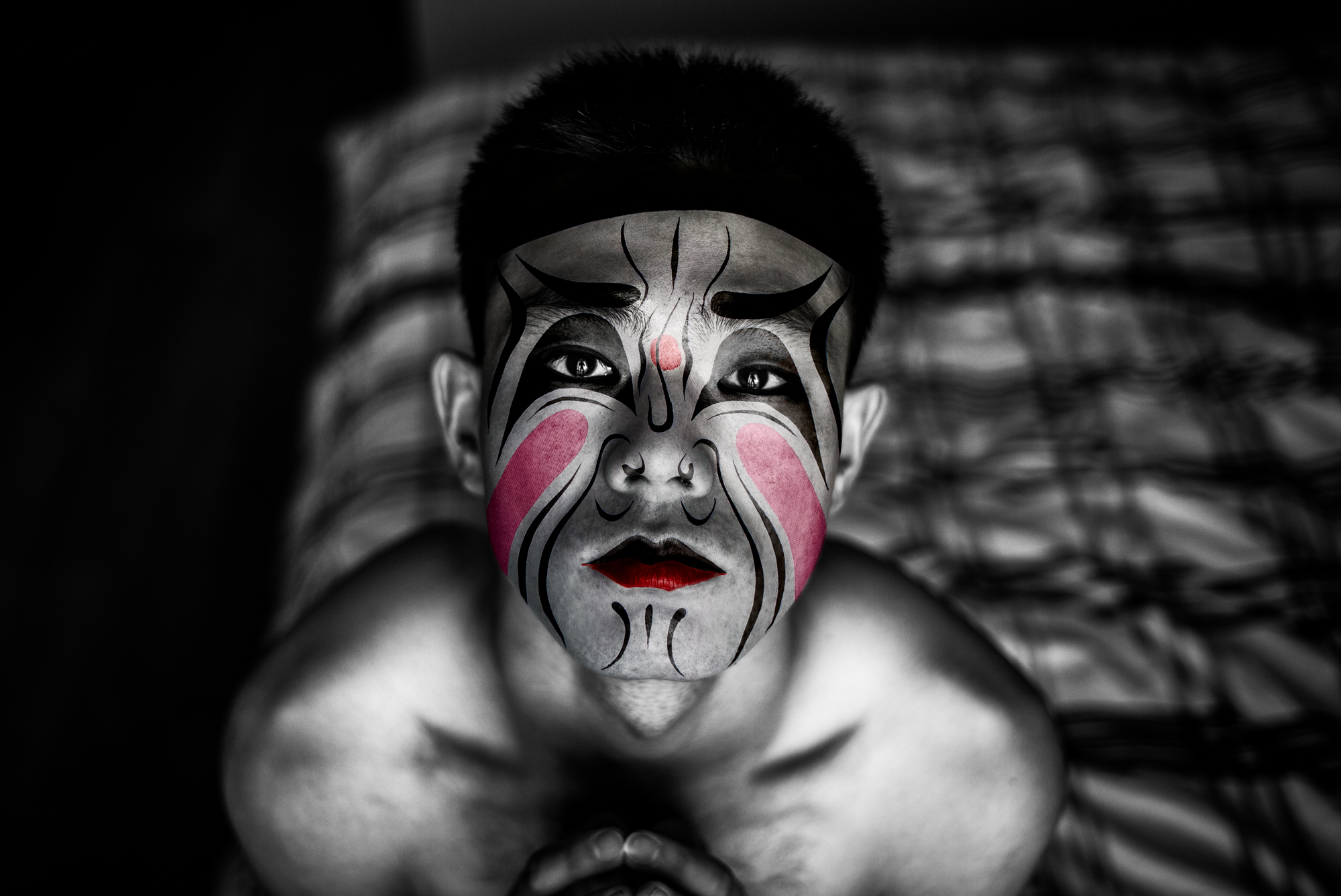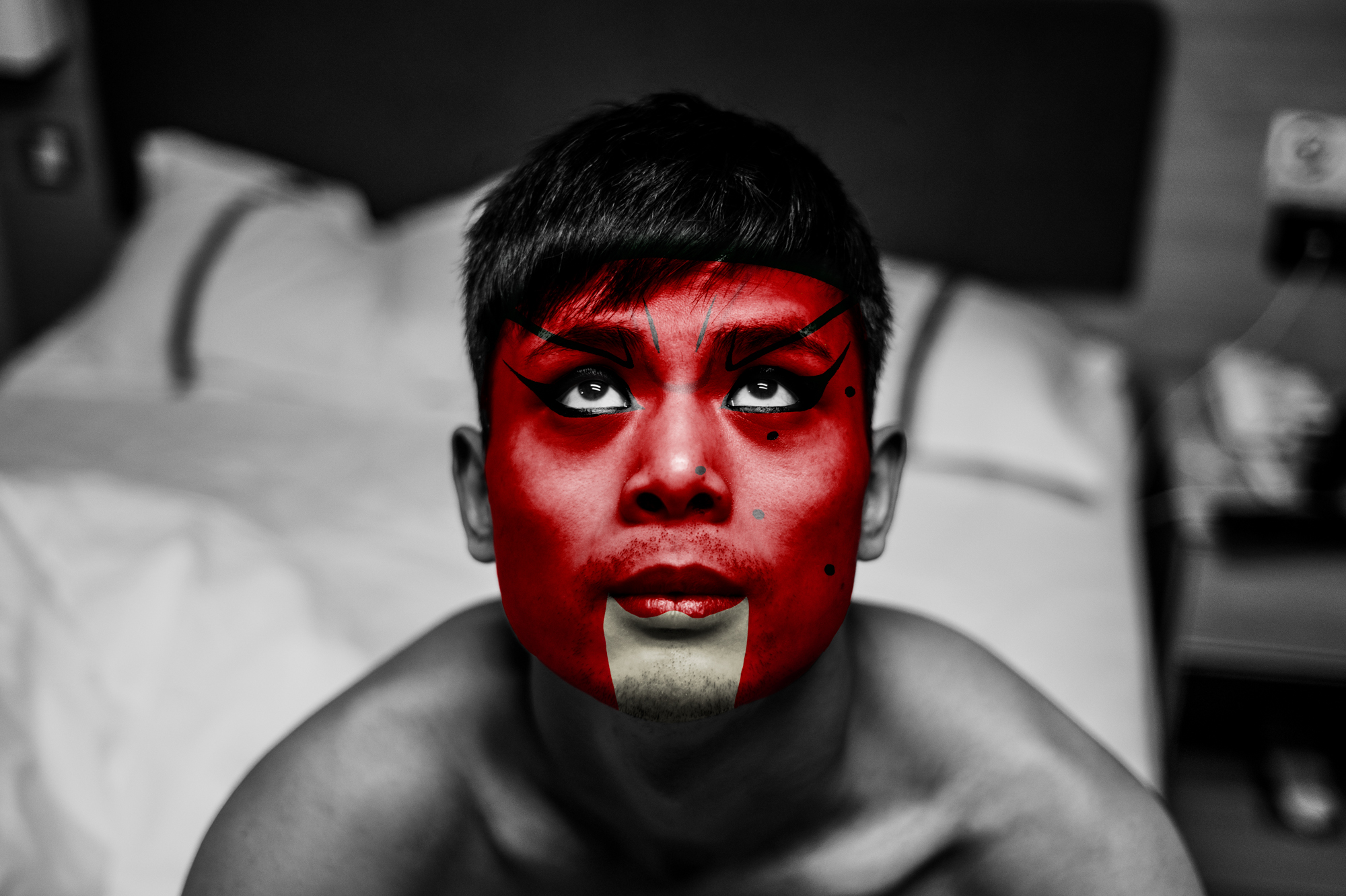Comme dans l’Opéra de Pékin traditionnel, les personnages sont exclusivement masculins. En les maquillant à l’aide de masques inspirés de cet art ancestral, j’ai voulu traduire ce que j’ai ressenti à leur contact : une émotion profonde face au courage et à la détermination de ces garçons. La plupart viennent de provinces lointaines et se sacrifient, portés par l’espoir d’une vie meilleure.