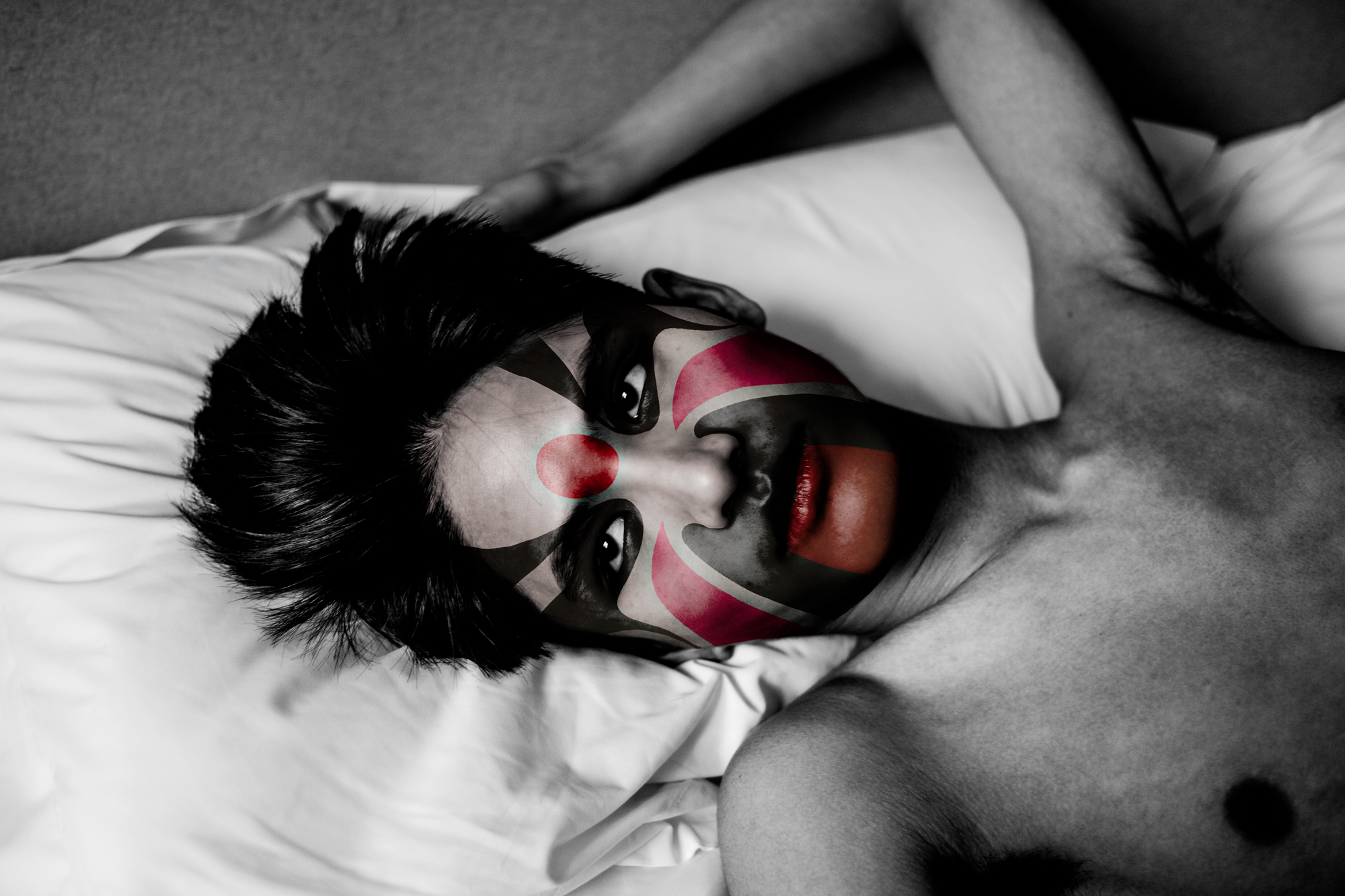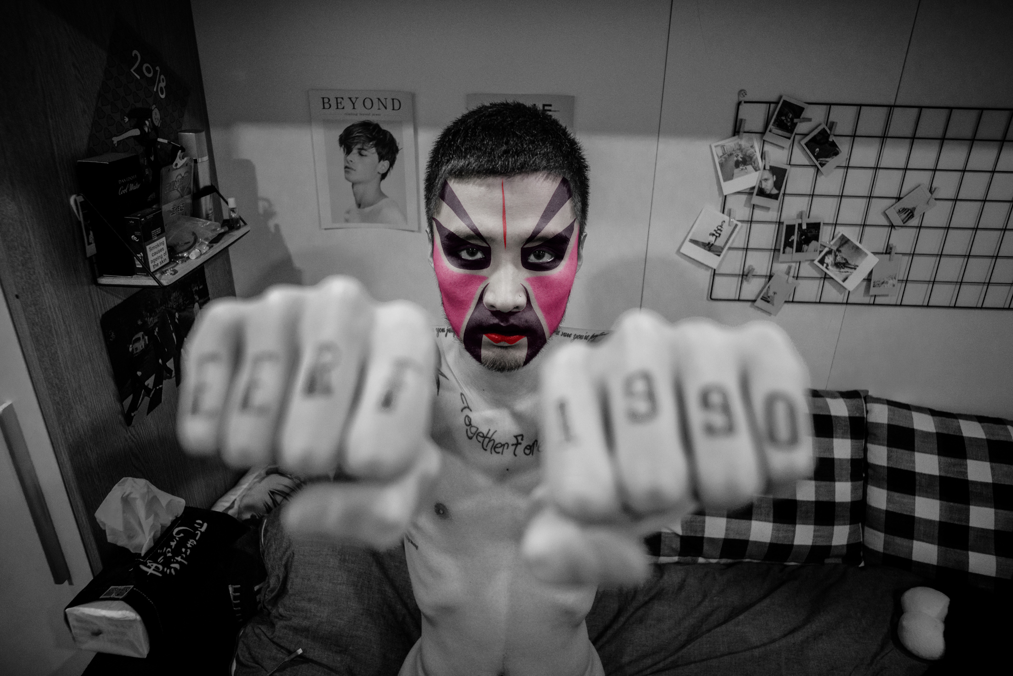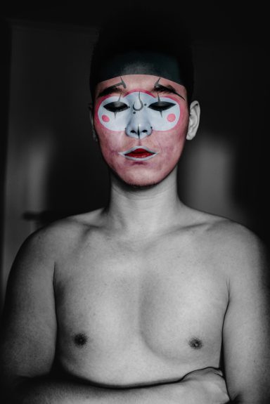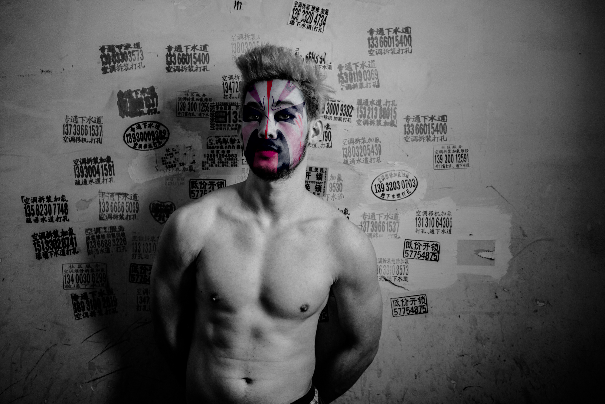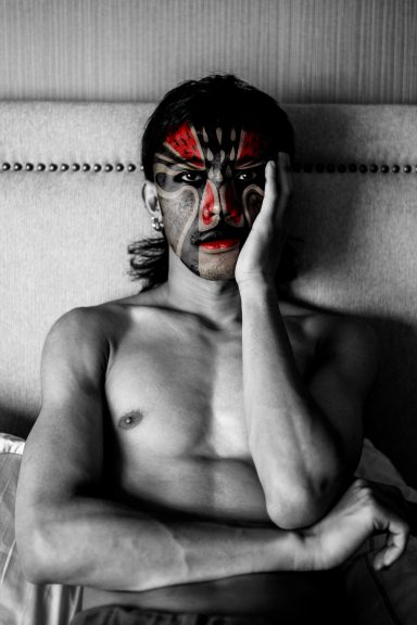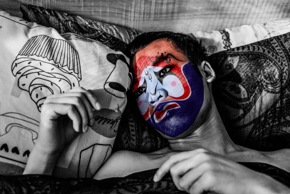 Comme dans l’Opéra de Pékin traditionnel, les personnages sont exclusivement masculins. En les maquillant à l’aide de masques inspirés de cet art ancestral, j’ai voulu traduire ce que j’ai ressenti à leur contact : une émotion profonde face au courage et à la détermination de ces garçons. La plupart viennent de provinces lointaines et se sacrifient, portés par l’espoir d’une vie meilleure.